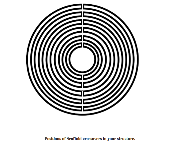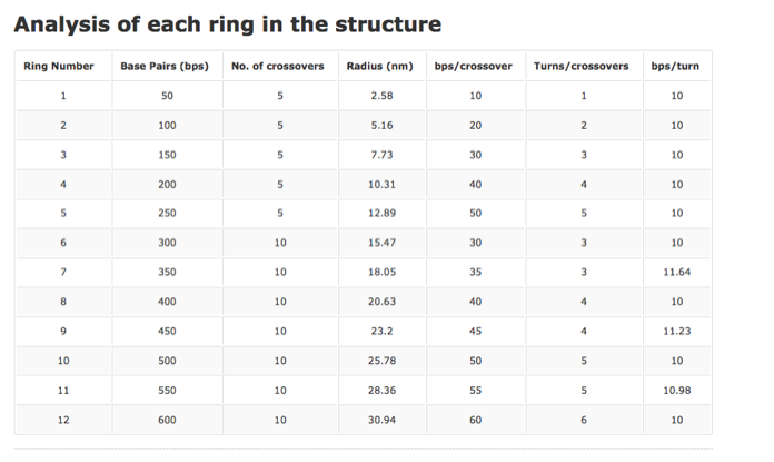The Radius of the outer-most ring that you entered is 30 nm. The Radius has been modified to 30.94 nm. The Number of rings, which can fit into the structure, is 12. The total size of scaffold used by your structure is 3900 bps. The number of base-pairs of M13 left unused is 3349 bps.