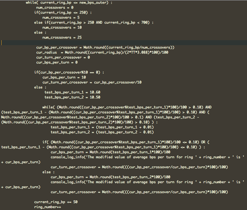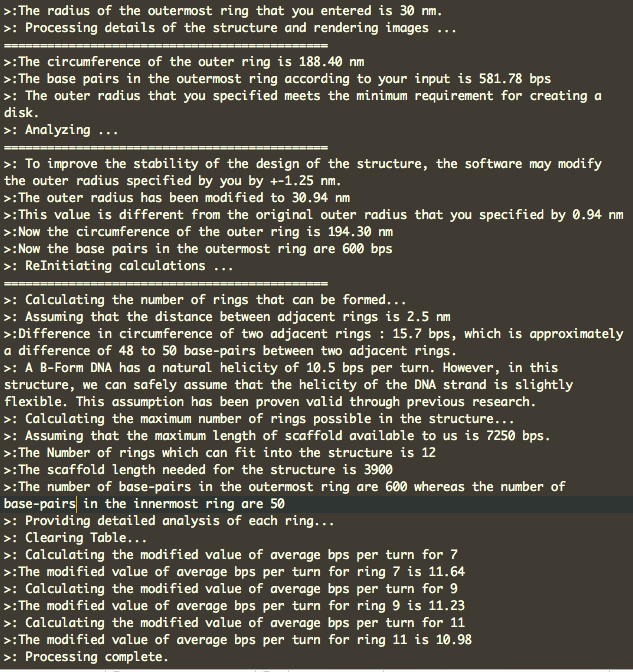 First the software checks if the input provided by the user is a valid float or integer and other validation tests are done. After this, the software checks if the size input by the user would be able to fit into the M13 scaffold. Once the tests are successful, then it calculates the circumference of the outermost ring. Then the number of base-pairs in the outermost ring is calculated. Then the software analyses the number of base pairs in the outermost ring and tries to adjust its value to meet the stability constraints. To improve the stability of the design of the structure, the software may modify the outer radius specified by the user by +/- 1.25 nm.