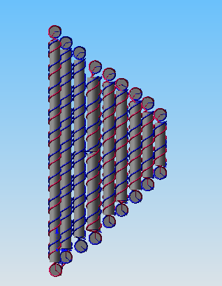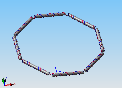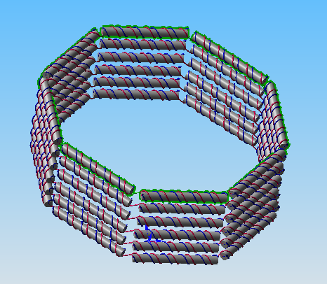 The calculations are reinitiated using the new radius. Accordingly, the maximum number of rings possible in the structure is calculated by assuming the distance between adjacent rings to be 2.5 nm. Then a detailed analysis of each ring is provided which has all the details like ring number, base pairs in the ring, number of crossovers radius, bps/crossover and turns/crossovers bps/turn. Another adjustment that the software makes is in the base-pairs per turn. It has been shown in previous research [6] that the DNA strand is flexible with respect to the number of base-pairs per turn throughout the structure. However, this variation must not be more than 1.5 base-pairs per turn at an average. Hence our software ensures that the variation in the number of base-pairs per turn is within the accepted limits. The software then renders two images showing the structures of the generated rings from two different perspectives. These images also display the positions of scaffold crossovers in the structure. Finally, the software displays the scaffold length used and the length of M13 left unused. It is assumed the unused length of M13 does not interfere with the remaining structure. This software is useful in the sense that the end-user would not need to worry about knowing all the designing principles for creating the structure since the structure rendered by our software already obeys all the designing principles stated in past research. Thus, a lot of time of the end-users would be saved.