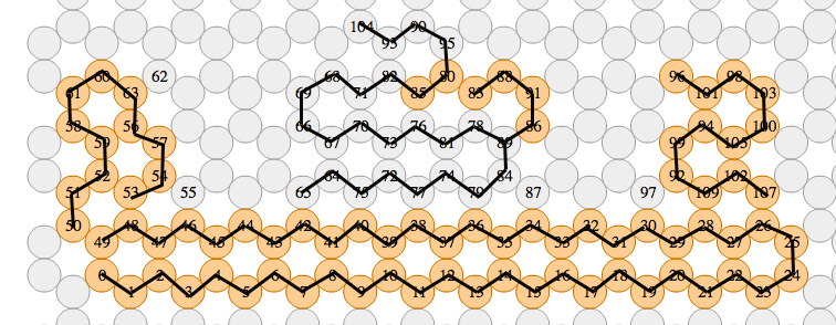 A B-form DNA strand can be assumed to contain 10.5 bps per helix. Thus, this implies that the strands rotate by 240 degrees about the helical axis every 7 bps, by 480 degrees every 14 bps and two complete turns or 720 degrees every 21 bps. caDNAno also gives us the option to extend the length of the strands in the honeycomb lattice by multiples of 21 bps. In a honeycomb lattice, each strand has up to three neighbours in the honeycomb lattice. (Fig. 2) Hence, to ensure that the DNA strands are confined to the honeycomb lattice, crossovers can be placed to each of the three neighbouring strands in constant intervals of 7 bps or every 240 degrees. It has been stated in previous research [3], that deviating from the constant 7-bp crossover spacing rule in the honeycomb-lattice packing causes local under twist as well as axial strain [4].