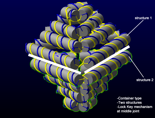 3D DNA origami has been achieved using different construction techniques. There are techniques for creating hollow container-like objects by folding up single layers of helices [25,2,27]. Hao Yan group have also presented a strategy to design and construct self-assembling DNA Nanostructures, which form 3D curved shapes. Also, it is possible to create space-filled structures using a multi-layered approach [26,4,28,18], though the yield is less and takes longer. One can either use a square lattice or a honeycomb lattice for building space-filled multi-layered structures. There also exist a few techniques to join two specific kinds of 3D structures. For space-filled 3D structures using honeycomb lattice, there are two ‘Lock and Fit’ techniques to combine two individual 3D pieces. One is using the ‘Slotted cross’ shape technique and the other is using ‘Squared nut’ shape technique. For joining space-filled 3D structures using a square lattice, there is no such ‘Lock and Fit’ technique in place currently. We also didn’t come across research, which reveals a definite technique for combining two individual 3D container structures. Another challenge for us while creating a large 3D shape was the size of the scaffold. Currently, most of the DNA origami is done using the scaffold of the single stranded M13 virus. M13 scaffold has a large length of over 7000 bps and it has low secondary structure formation, which makes it the best option for DNA origami. To create larger structures, we would need multiple scaffolds since a length of 7000 base pairs would not be sufficient for the purpose. Research has been done to scale up 2D DNA origami using tiles instead of staplers, but no corresponding research work for scaling 3D structures using some kind of 3D tiles was observed.