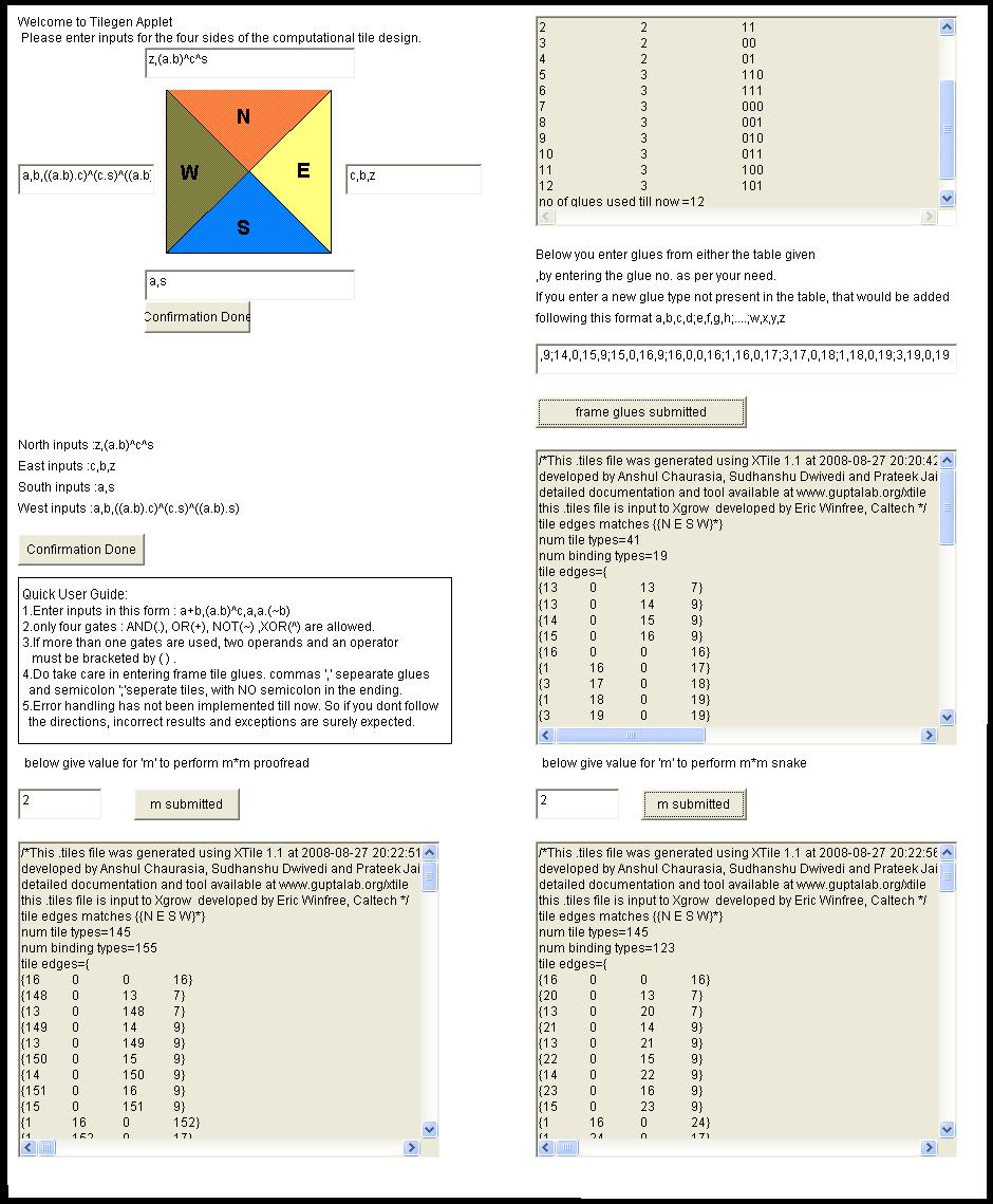 4. Now to run the XTile version 1.1, open the Tilegen.htm webpage, the applet will be loaded in it. You can enter the value of m for an m*m scheme for proofread and/or snake error correction scheme. The resultant output '.tiles' file code will be displayed in a corresponding window. You need to select the entire code and paste it in a text editor, then save it with a name of your choice with a '.tiles' extension.